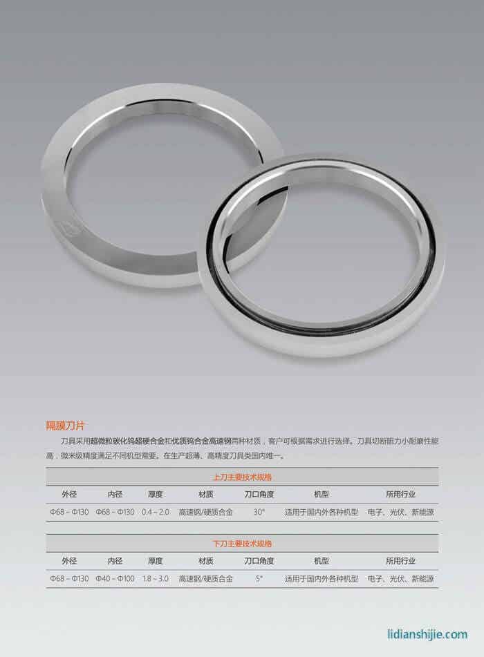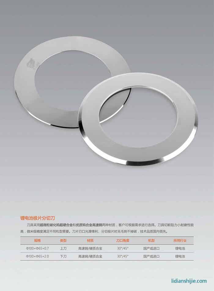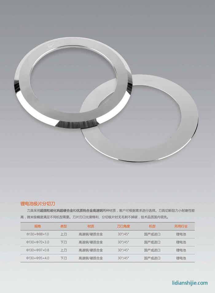鋰電池極片分切刀和隔膜刀片是公司近年來特別針對鋰電池行業(yè)對分切刀和切口的較高要求專門研發(fā)生產(chǎn)的重點產(chǎn)品。在鋰電池分切刀、隔膜刀行業(yè)國內排名上,歐林機械排名第一,我公司排名第二。這兩種產(chǎn)品均可采用超微粒碳化鎢硬合金和優(yōu)質鎢合金高速鋼兩種材質,客戶可根據(jù)需要進行選擇,刀具切斷阻力小耐磨性能高,微米級精度滿足不同機型需要。鋰電池極片分切刀刀片刃口光滑鋒利、分切極片時無毛刺,不掉碳,技術品質國內領先,其中的蝶形刀廣泛應用于電子電容器行業(yè),在國內市場的占有率高達80%以上,遙遙領先于同行業(yè),同時可滿足一些海外用戶的需求;隔膜刀片在生產(chǎn)超薄、高精度隔膜刀具類領域內是國內唯一。