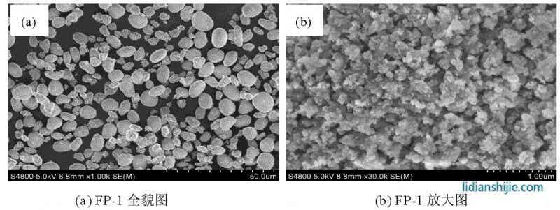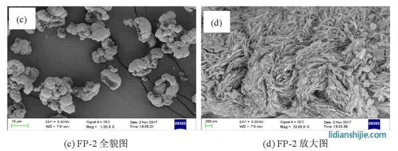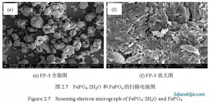 圖 2.7 是 Fe PO4·2H2O 和無水 Fe PO4的掃描電鏡圖,與氨水沉淀制備的十分相似,只是在具體細節(jié)上有所區(qū)別??刂平Y(jié)晶法制得的 Fe PO4·2H2O 呈類球形;經(jīng)過陳化晶化處理,F(xiàn)e PO4·2H2O 顆粒明顯增大,變成球殼狀,具有微納米結(jié)構(gòu);600 ℃焙燒處理制得的無水 Fe PO4基本保持了燒前 Fe PO4·2H2O 的形貌,仍為球殼狀。