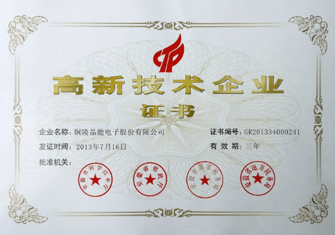 2013年10月28日,我公司收到安徽省科技廳、財政廳、國家稅務局和地方稅務局聯合頒發的《高新技術企業證書》,證書有效期三年。