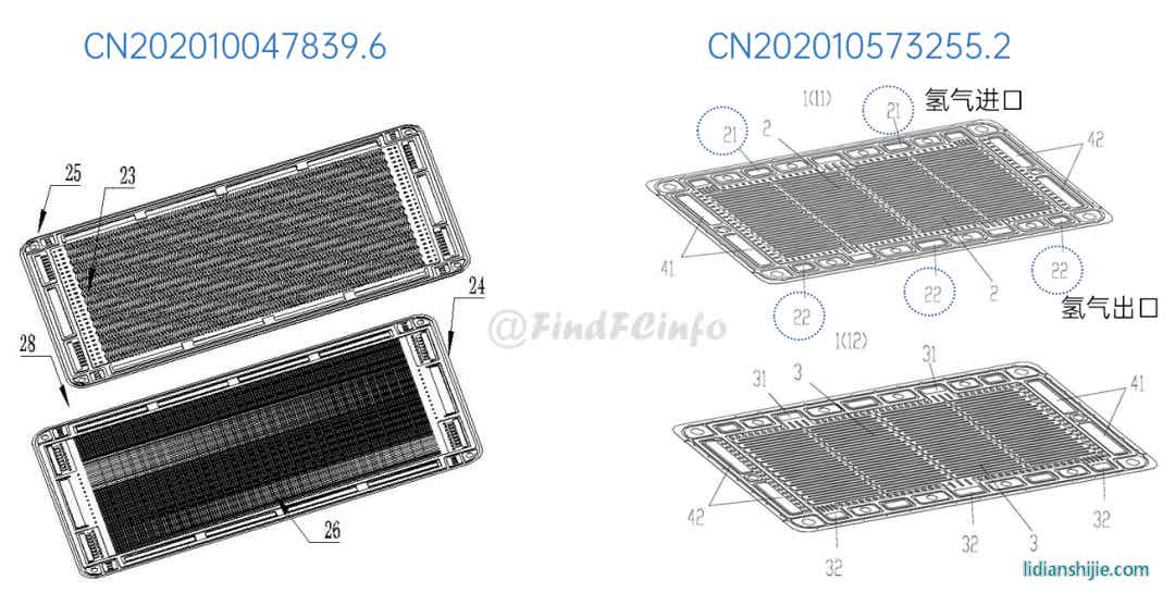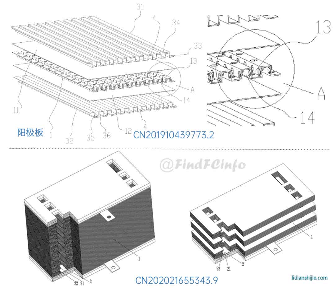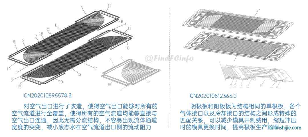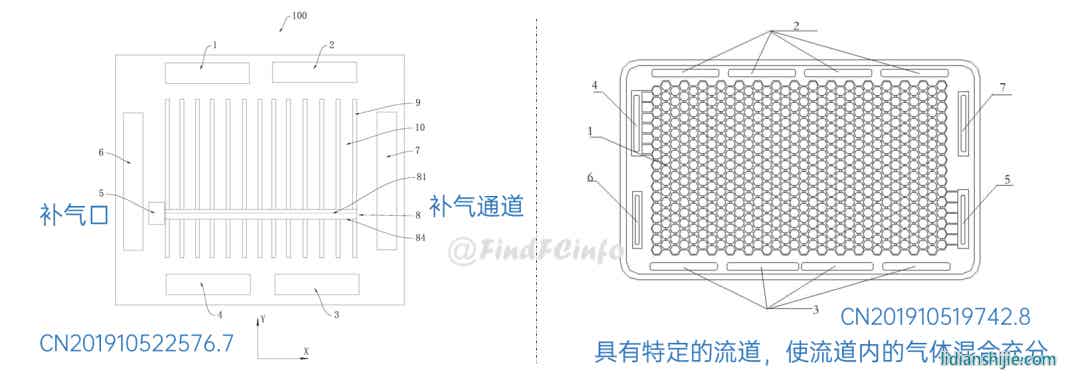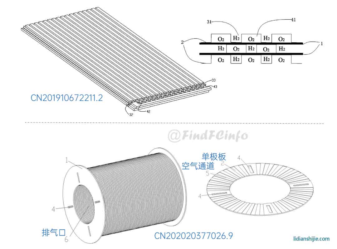 另外,格力還公開(kāi)了兩種風(fēng)冷型電堆,如專利CN201910672211.2公開(kāi)的電堆中,膜電極和單極板在電池單元疊置方向間隔交錯(cuò)設(shè)置,每一單極板的兩側(cè)分別形成陽(yáng)極氣體槽道和陰極氣體槽道,相比于現(xiàn)有常規(guī)金屬雙極板燃料電池結(jié)構(gòu),該電堆厚度能大約降低一半,極板兩側(cè)分別為陽(yáng)極氣體和陰極氣氣體的流動(dòng)空間。專利CN202020377026.9中電堆增加了進(jìn)風(fēng)區(qū)域面積,形成了更加均勻的進(jìn)風(fēng)結(jié)構(gòu),有利于提高陰極反應(yīng)氣體傳質(zhì)、提高陰極反應(yīng)氣體流量、降低其流動(dòng)阻力等。