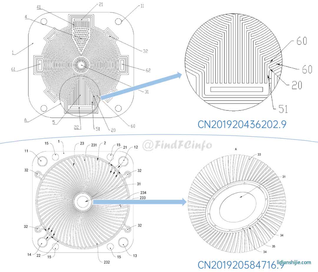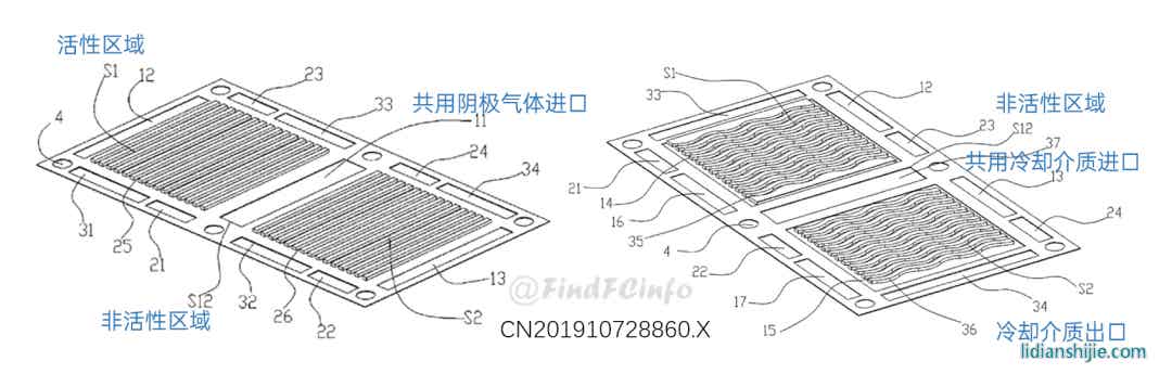 格力雙極板的主要類型為金屬雙極板,大部分雙極板用于水冷型電堆,少數(shù)雙極板用于風(fēng)冷型電堆。在格力早期申請(qǐng)的雙極板專利中,有采用將冷卻水入口設(shè)置在極板中心位置處的設(shè)計(jì),以更好地對(duì)極板中央反應(yīng)區(qū)域進(jìn)行冷卻,具體極板結(jié)構(gòu)可參見(jiàn)下圖。