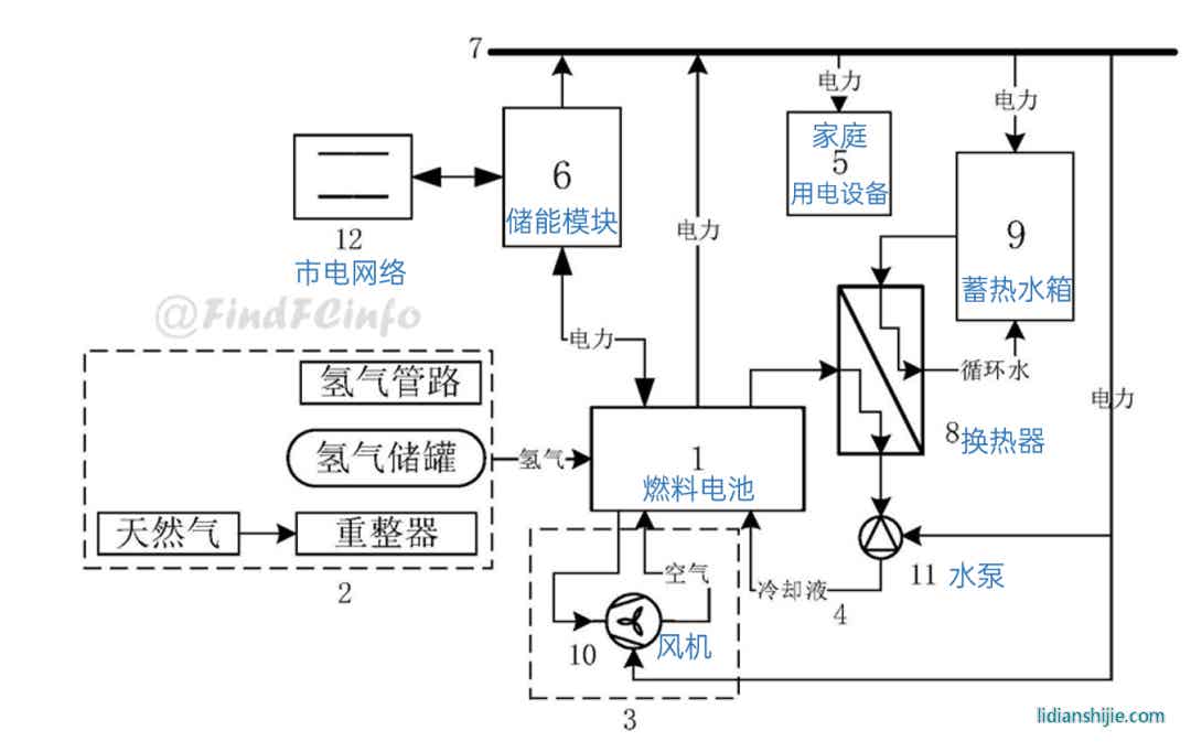 專利CN202020515628.6公開(kāi)了一種家用熱電聯(lián)供系統(tǒng),其中蓄熱模塊能夠回收燃料電池的廢熱,并將熱能提供給家庭使用;儲(chǔ)能模塊能夠接收并存儲(chǔ)燃料電池的電能;直流供電模塊能夠?qū)⑷剂想姵睾蛢?chǔ)能模塊提供的電能輸送給家庭用電設(shè)備。