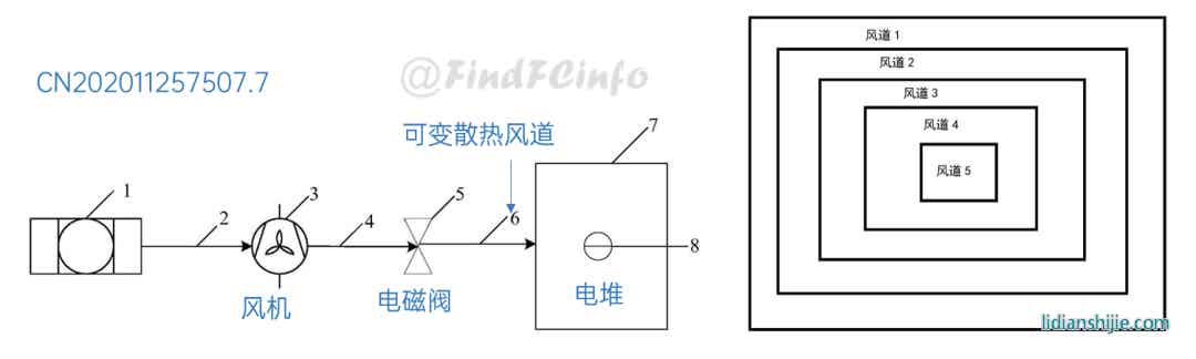 在燃料電池?zé)峁芾矸矫?,格力公開(kāi)的專利既涉及風(fēng)冷型電堆,也涉及到水冷型電堆。在風(fēng)冷型電堆熱管理上,專利CN202011257507.7通過(guò)在電堆和風(fēng)機(jī)之間設(shè)置可變散熱風(fēng)道,利用控制器調(diào)整可變散熱風(fēng)道上多個(gè)散熱子風(fēng)道的開(kāi)啟數(shù)量或關(guān)閉數(shù)量,來(lái)實(shí)現(xiàn)對(duì)電堆的精準(zhǔn)控溫。