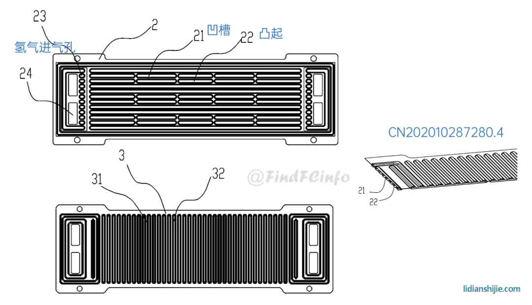 在電堆結(jié)構(gòu)方面,格力的改進(jìn)主要集中在提高電堆功率密度、熱交換性能以及改善氣體分布不均衡等。例如,專利CN201910439773.2公開(kāi)了一種緊湊型燃料電池結(jié)構(gòu),兩個(gè)并聯(lián)的子電池共用一個(gè)陽(yáng)極板,其中第一陽(yáng)極氣體槽道13、第二陽(yáng)極氣體槽道14的陽(yáng)極氣體可以互通,利用陽(yáng)極板雙側(cè)的供氣可同時(shí)滿足兩個(gè)膜電極的氣體消耗;專利CN202021655343.9通過(guò)第一內(nèi)壁部21的結(jié)構(gòu)增大氣體流通通道2的流通面積,使氣體的分配更加均勻,提高電堆的工作效率。