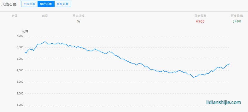 首先從天然石墨的價(jià)格來看,在今年初碰到了一個(gè)高點(diǎn)之后,下跌的幅度比較大,鱗片石墨直接從6500元/噸跌至九月初的3400元/噸。但這個(gè)產(chǎn)品最近兩個(gè)月時(shí)間開始有所反彈,價(jià)格已經(jīng)回到了4600元/噸。