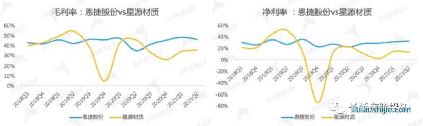 2、行業毛利率最高,35%-50%之間,媲美食品飲料行業平均毛利率,其中恩捷股份以濕法隔膜的生產制造為主,毛利率45%-50%,凈利率25%-35%,對比可比公司星源材質毛利率和凈利率,恩捷股份盈利行更加穩定,同時在成本和費用端具備明顯的優勢;