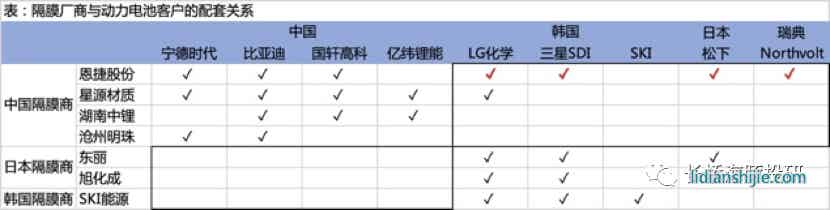 1、行業集中度最高,國內CR3約80%,CR5則超90%,其中恩捷股份以45%左右的市占率占第一的寶座,客戶方面則不僅綁定了國內的寧德時代、比亞迪、國軒高科,還綁定了LG化學(為期5年的濕法隔膜訂單)、松下、三星等海外動力電池龍頭;