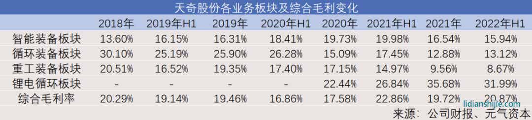 2022年上半年鋰電池循環(huán)板塊營業(yè)收入同比增長114.36%達到8.16億元,營收占比為39.33%(同期智能裝備板塊營收占比已降至34.21%),成為天奇股份第一大營收板塊,毛利貢獻更是達到率58.39%。