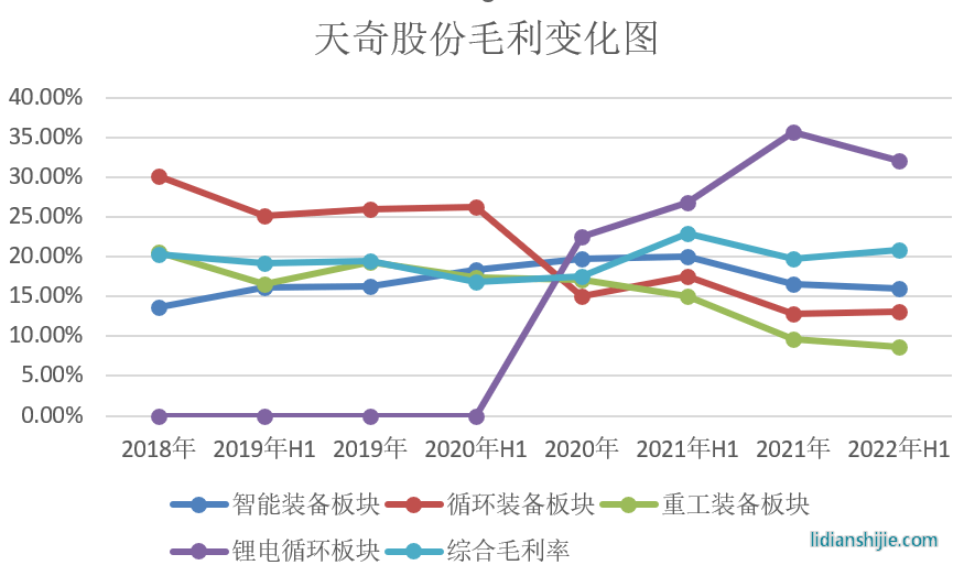 另外,從天奇股份各業(yè)務(wù)版塊毛利率變化來看,鋰電池循環(huán)業(yè)務(wù)也已經(jīng)成為其綜合毛利變化的重要推手。從其各個板塊的毛利變化來看,2018年至2020年間,天奇股份智能裝備業(yè)務(wù)毛利率整體處于增長趨勢,而循環(huán)裝備業(yè)務(wù)毛利率從30.1%一路下行至15.09%,同時期重工裝備板塊毛利也處于持續(xù)下降趨勢,進而使得其綜合毛利率從2018年的20.29%降至2020年的17.58%。