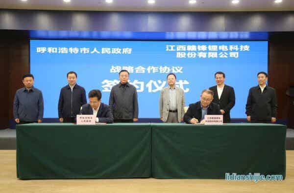 在內蒙古自治區黨委常委、市委書記包鋼,江西贛鋒鋰業集團股份有限公司董事長李良彬共同見證下,呼和浩特市委副書記、市長賀海東,江西贛鋒鋰電科技股份有限公司董事長、總裁戈志敏代表雙方簽署協議。