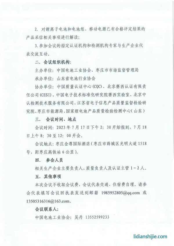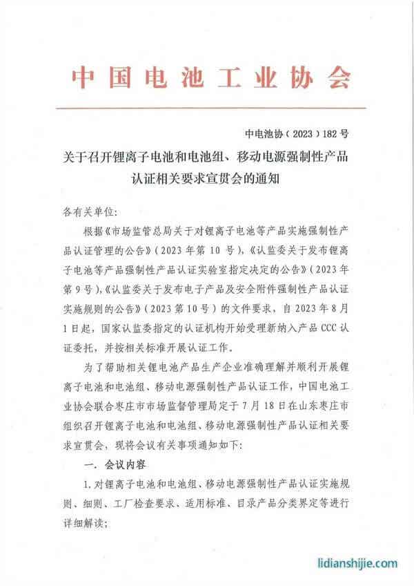 關(guān)于召開(kāi)鋰離子電池和電池組、移動(dòng)電源強(qiáng)制性產(chǎn)品認(rèn)證相關(guān)要求宣貫會(huì)的通知 2023-07-05 822240 核心提示:下載附件:參會(huì)回執(zhí)表.docx作者:中國(guó)電池工業(yè)協(xié)會(huì) 下載附件: 參會(huì)回執(zhí)表.docx 作者:中國(guó)電池工業(yè)協(xié)會(huì) 點(diǎn)贊 0舉報(bào)收藏 0打賞 0評(píng)論 0分享 104 更多>同類(lèi)鋰電資訊 • 容誠(chéng)電子落地濟(jì)源 萬(wàn)洋拓展鋰電領(lǐng)域新布局 • 資源稅對(duì)鋰礦成本的影響 • 美國(guó)轉(zhuǎn)向油車(chē)開(kāi)始取消亞洲鋰電池訂單,美股鋰電 • 鋰電池打響漲價(jià)“第一槍”,德加能源電池系列價(jià) • 感覺(jué)未來(lái)主流會(huì)是大電池增程 • 德方納米榮獲2025年度正極材料優(yōu)質(zhì)供應(yīng)商稱(chēng)號(hào) • 奔馳正加速推進(jìn)電動(dòng)車(chē)固態(tài)電池上車(chē)進(jìn)程 • 磷酸鐵鋰電池漸成市場(chǎng)主力 • 迷之碳酸鋰庫(kù)存 • 鋰電產(chǎn)業(yè)鏈周記 | 寧德時(shí)代聯(lián)手五大車(chē)企發(fā)布10