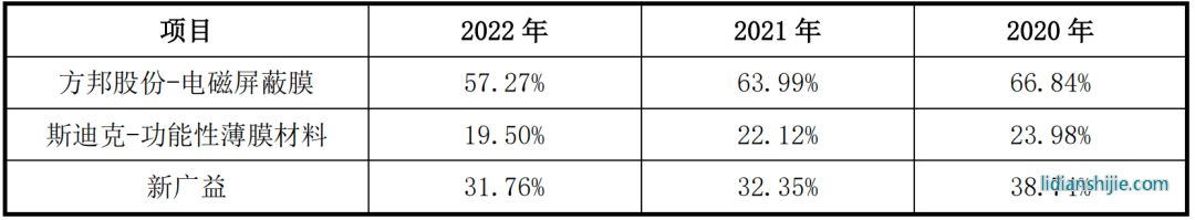 報告期內,新廣益抗溢膠特種膜的毛利率分別為 33.09%、 28.51%、28.65%;強耐受性特種膜的毛利率分別為 50.84%、 41.67%、39.73%。與同行業上市公司之間存在一定差異,但產品方面同樣具有較大差異。