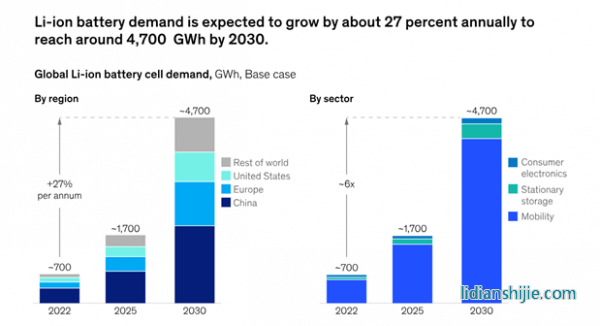 報(bào)告顯示,全球?qū)︿囯x子電池的需求預(yù)計(jì)將在未來(lái)十年飆升,從2022年的約700GWh增加到2030年的約4.7TWh。此外,用于電動(dòng)汽車(chē)等移動(dòng)應(yīng)用的電池將在2030年占大部分需求-約4300GWh。