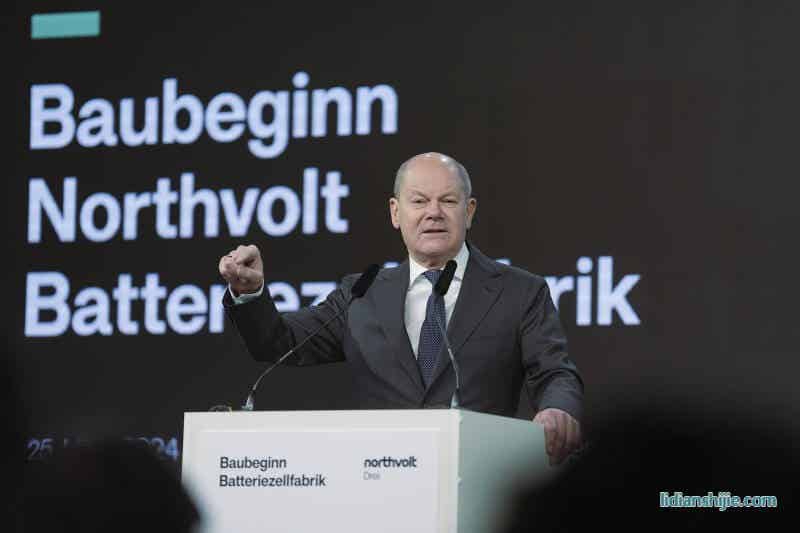 當地時間2024年3月25日,德國石勒蘇益格-荷爾斯泰因州,德國總理奧拉夫·朔爾茨在Northvolt工廠建設開始前發表講話。德國總理肖爾茨和經濟部長哈貝克出席了Northvolt工廠的正式開工儀式,該工廠將從2026年開始生產電動汽車用電池。 視覺中國 圖