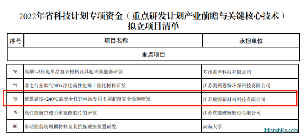 5月23日,江蘇省科技廳公示了2022年省科技計劃專項資金(重點(diǎn)研發(fā)計劃產(chǎn)業(yè)前瞻與關(guān)鍵核心技術(shù))擬立項目,星源材質(zhì)全資子公司江蘇星源的“破膜溫度≥240℃高安全性鋰電池專用多層超薄復(fù)合隔膜研發(fā)”項目位列其中!