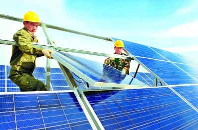 甘肅高崖子灘光伏產(chǎn)業(yè)園工人在安裝光伏發(fā)電板
