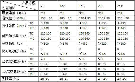 產品特點:1、微孔大小適中,孔徑分布均勻,通透性好;2、熱收縮率低;3、與電解液的浸潤性能優良,吸液率高;4、閉孔溫度合適,耐高溫性能優異,安全可靠。