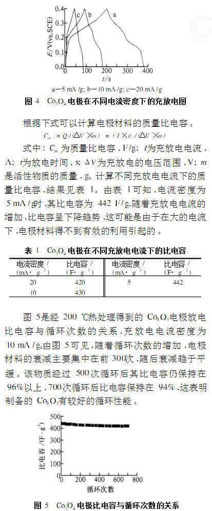 LinChuan等使用醇鹽水解法制備了超細(xì)Co2O3電極活性材料,單電極比電容達(dá)到291F/g。此外CoOx和其他金屬氧化物的復(fù)合也被廣泛地研究。筆者以檸檬酸為模板,以硝酸鈷為原料利用水熱法制備了前驅(qū)體,200℃熱分解制得Co3O4,研究其在6mol/LKOH溶液中和-0.1~0.5V(vs.SCE,下同)電位范圍內(nèi),循環(huán)伏安、恒流放電等電化學(xué)電容性能。
