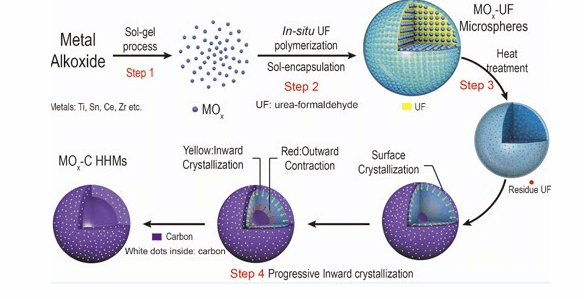 他們從聚合誘導膠體凝聚法出發(fā),首次提出了基于實心顆粒內(nèi)部梯度結晶的獨特方式來直接在顆粒內(nèi)部構筑空心復合結構。在實驗中,他們通過對具有較低結晶度的有機-無機復合前驅(qū)體結晶過程的精確控制,實現(xiàn)了實心顆粒由外及里的逐步結晶,并通過顆粒內(nèi)部應力的累積及調(diào)控使得顆粒的內(nèi)核自動分裂而直接產(chǎn)生空腔。此方法操作簡單、綠色環(huán)保、成本低、可規(guī)模化生產(chǎn)且具有普適性,可以成功制備一系列不同氧化物的復合空心結構。基于相關方法制備的Li4Ti5O12-C空心復合微球可作為鋰離子電池負極材料,并表現(xiàn)出優(yōu)異的循環(huán)穩(wěn)定性和高倍率性能。