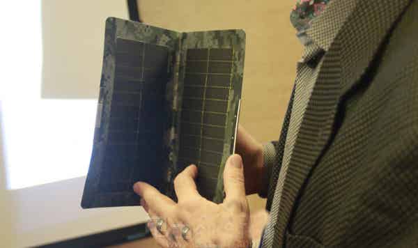 他舉例說,目前,美軍已經采用了Alta Devices公司的太陽能電池,上圖這個小巧的兩張A4紙大小的電池板可以產生10瓦電力,“另外,在野外帳篷頂部也可以采用我們的電池板來產生電力。”他指出。
