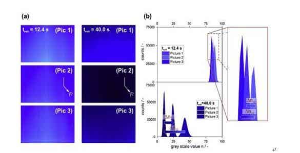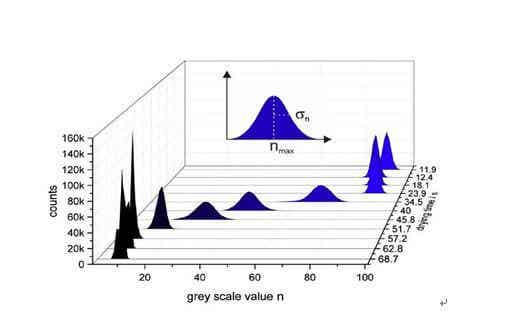 接下來,本文關注了向涂層噴射空氣流時所捕獲第二張照片的差異。圖5a是在兩個干燥時刻,各自連續(xù)拍攝的三張照片的比較。捕捉第二張照片時,用加壓空氣噴嘴向照相區(qū)域涂層上直接噴射空氣氣流。干燥時間12.4s時,空氣吹掃涂層熒光變化不明顯,而40s時空氣吹掃涂層后,熒光明顯減少。圖5b是六張照片的高斯分布圖,在較短干燥時間(texit=12.4s)時,三張照片中獲得的nmax都很大,差值Δn12和Δn23小并且都落在實驗值偏差范圍內。而texit=40.0s時,三個nmax都很小,噴嘴作用導致的差值Δn12和Δn23很大。在干燥的后期階段,涂層表面液相消失,孔隙內的液相排除成為主要干燥過程,液相分布與孔結構分布相關,與初始液相狀態(tài)不一樣。