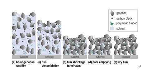 (a)溶劑蒸發(fā)引起初始均勻濕涂層收縮;(b)溶劑蒸發(fā),石墨顆粒彼此接近;(c)當石墨顆粒獲得最密集的組態(tài)時,涂層收縮終止;(d)孔隙消失,溶劑進一步的蒸發(fā)導致液相散出多孔電極結構;(e)干燥的電極。