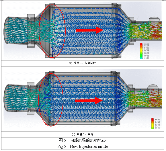圖5是用“流動軌跡”的方式直觀地顯示內部流體速度場分布,從圖中顏色可看出流體的速度,而箭頭表示出流體的運動軌跡,Flow Simulation還可以做出動畫,能更直觀模擬出流體從進到出的整個動態過程。項目1和項目2氣體流動區別,詳見圖5中紅圈位置所示:(1)項目1:氣流首先直接從催化體端面的中部進入,然后再在催化體內向周邊擴散,但總體仍是沿軸向(紅箭頭方向)流動;(2)項目2:氣體在流進入催化體前被強制分流各個位置再進入催化體內的獨立流道,已進入催化體的氣體可一直保持均勻流動,這與實際情況非常吻合的。氣流從兩種催化體流出后的狀態幾乎一致,沒有太大差別。