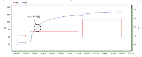 對比化成曲線不難發現極卷干燥的電池有很明顯的水分分解平臺,造成這種結果的原因是極卷在轉運過程和化成前的工序吸水過多造成的,致使電池整體水分含量超高,正常電池開始化成后,電壓是直線上升的趨勢,極卷實驗電池開始化成電壓上升一段就停止這說明電池可能在形成SEI 膜時有較多的副反應參與,所以這個階段電壓沒有上升的原因可能是在持續形成SEI 膜,導致產氣量上升。因此對于極卷干燥來講,必須嚴格控制車間環境的水分。通過整個化成時間來看,極卷干燥生產的電池極化較大。