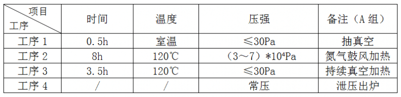 選用本公司生產的磷酸鐵鋰A 型電池進行干燥實驗,使用真空非接觸式干燥爐,對電池采用真空熱輻射干燥。干燥溫度為105±5℃,時間為5~12h,取磷酸鐵鋰A 型電池30 支電池,放入真空接觸式干燥爐中,干燥工藝流程如表1-3: