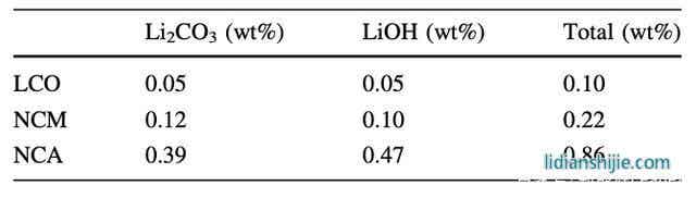 第一性原理計算顯示Ni基材料的晶體內部比LCO材料存在更多的肖基特缺陷,從而在晶體內部產生空位,從而形成Li-O化合物,這些化合物則會進一步與水蒸氣或CO2等反應,生成LiOH、Li2CO3等雜質。下表為三種材料表面的LiOH、Li2CO3雜質的含量,從表中可以看到相比于LCO材料,NCA和NCM材料表面的LiOH、Li2CO3雜質含量會更高,特別是NCA材料表面的雜質含量可達LCO材料的8-10倍。