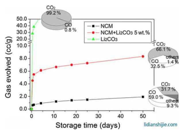 高溫存儲會加劇鋰離子電池的產氣,不同的正極材料也會對鋰離子電池的產氣現象產生影響,韓國仁荷大學的Yongseon Kim對LCO、NCM和NCA材料在高溫存儲過層中的產氣現象進行了研究,研究表明三元材料在高溫存儲初期的產氣現象要比LiCoO2更為嚴重,這主要是受到三元材料表面的LiOH和Li2CO3等雜質影響,但是隨著存儲時間的增加,LCO產氣量要高于三元材料。