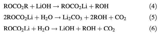 在之前的研究中作者認為H2O是引起電池產氣的必要因素,H2O引起LiPF6分解,并產生HF從而引起后續一系列的分解反應,引起電池產氣。但是該項實驗表明僅有LiPF6存在的情況下也會產生氣體,作者認為這可能是因為在實驗前電解液中已經存在痕量水,即便是痕量水也能夠誘發下式所示的反應。