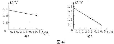2、應注意當電池內阻較小時,U的變化較小,圖象中描出的點呈現如實驗圖4(甲)所示狀態,下面大面積空間得不到利用,所描得的點及做出的圖線誤差較大.為此,可使縱軸不從零開始,如實驗圖4(乙)所示,把縱坐標比例放大,可使結果誤差小些.此時,圖線與縱軸的交點仍代表電源的電動勢,但圖線與橫軸的交點不再代表短路狀態,計算內阻要在直線上選取兩個相距較遠的點,由它們的坐標值計算出斜率的絕對值,即為內阻r.