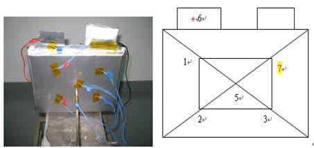 圖13為電池針刺試驗的連接及溫度采集點位置布局圖。圖14為針刺過程中電池電壓、溫度的變化測試曲線圖。